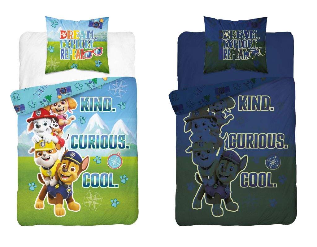Detské bavlnené obliečky so svietiacim motívom Paw Patrol: kontúry psíkov a nápisov ožijú v tme po nasvietení denným svetlom alebo žiarovkou (LED svetla nemusia fungovať). Predná a zadná strana majú rozdielny dizajn — z každej strany nový vzhľad. Svietiaci efekt postupne slabne po približne 5 praniach.