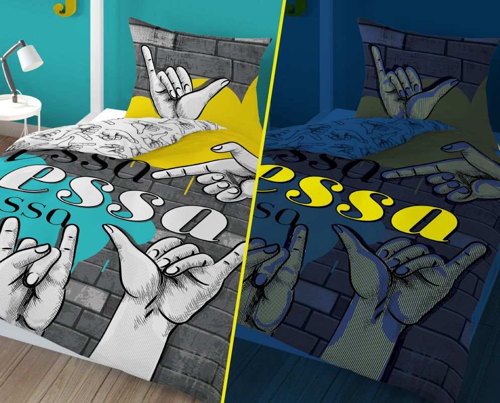Veselé bavlnené obliečky Essa s jedinečným svietiacim efektom — po nasvietení denným svetlom jemne žiaria v tme. Obojstranný dizajn umožňuje variabilitu vzhľadu a praktické zapínanie na zips zjednodušuje výmenu a údržbu.