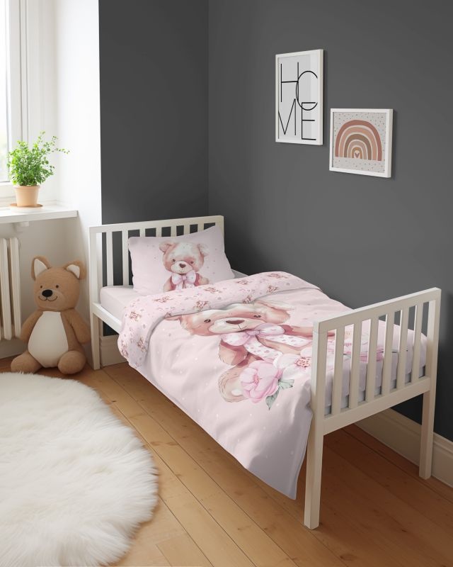 Obliečky „Macko mašle“ ponúkajú rovnováhu medzi štýlom a pohodlím — kombinujú elegantný dizajn s praktickými vlastnosťami kvalitnej bavlny, čo z nich robí skvelý doplnok do detskej izby.