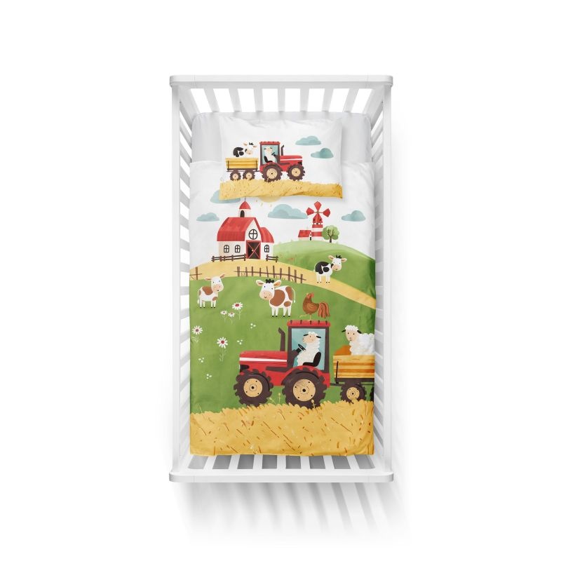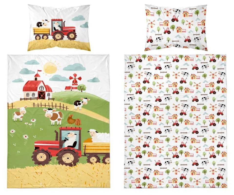 Obliečky s motívom farebnej farmy na kopci – ideálne doplnenie detskej izby s tematikou prírody a zvieratiek. Na jednej strane je výrazný ilustratívny motív statku, domčekov, zvieratiek a kopcov, na druhej strane jemný doplnkový vzor, ktorý ladí s hlavným dizajnom. Zapínanie na zips poskytuje pohodlné prezliekanie a 100 % bavlna zaručuje mäkkosť a priedušnosť.