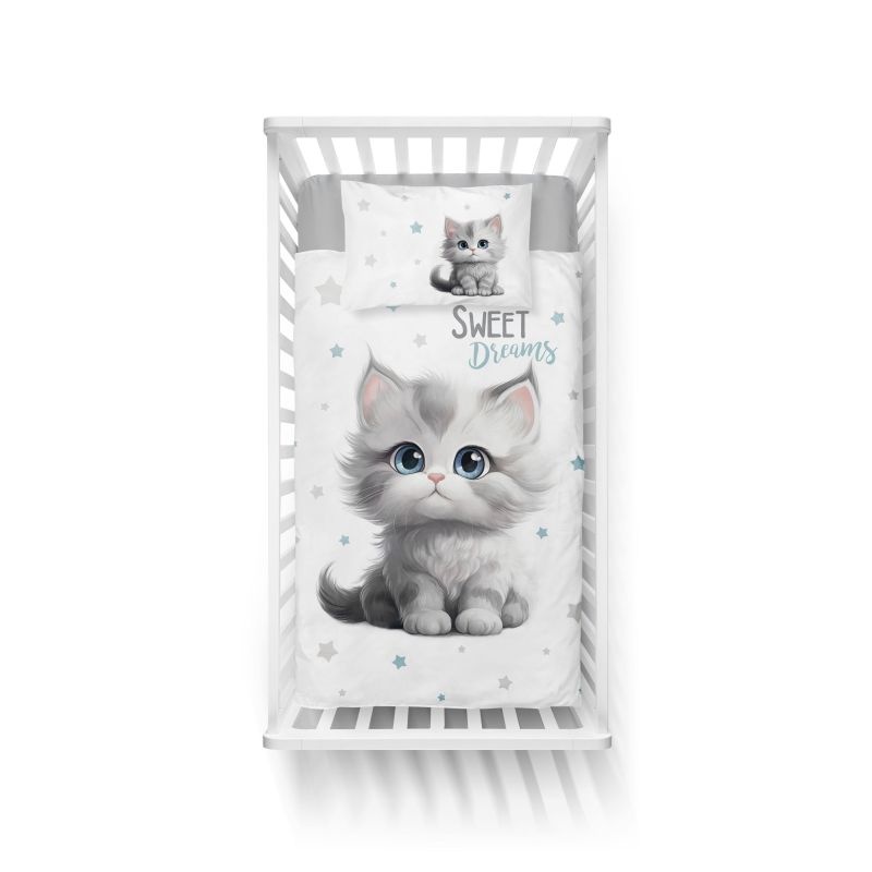 Rozkošné obliečky s motívom mačiatka a nápisom „Sweet Dreams“. Predná strana nesie detailný ilustratívny obrázok mačiatka, zatiaľ čo zadná strana obsahuje jemný vzor dopĺňajúci dizajn. Zapínanie na zips umožňuje jednoduché prezliekanie a 100 % bavlna zabezpečuje pohodlný a priedušný spánok.