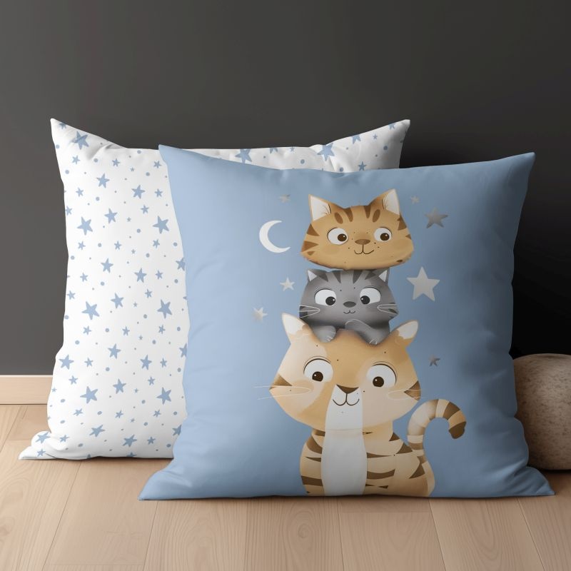 Obliečka na vankúšik s motívom mačičiek — každá strana má odlišný dizajn. Na jednej strane nájdete roztomilý vzor mačičiek na modrom pozadí, na druhej sú mačičky na pozadí s hviezdami. Zapínanie na zips zaručuje pohodlné nasadenie a snímanie obliečky. Materiál je 100 % bavlna, priedušný a príjemný na dotyk.