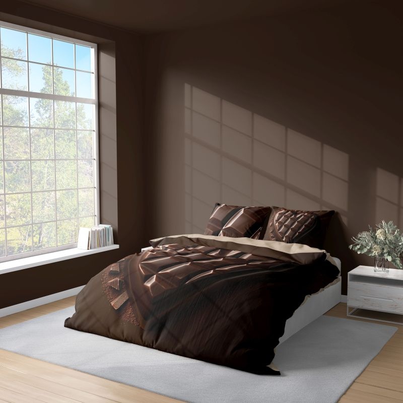 Francúzske obliečky z jemného mikrovlákna s 3D motívom čokoládového srdce vytvárajú v spálni teplú a romantickú atmosféru. Materiál zo 100 % polyesteru je hladký na dotyk, hebký, rýchlo schne, nekrčí sa a je veľmi nenáročný na údržbu. Vďaka potlači vysokého rozlíšenia krásne vyniknú sýte farby a realistické detaily čokolády aj po viacerých praniach. Rozmer 220 × 200 cm je vhodný na veľké prikrývky a spoločný spánok, ktorý poskytuje estetický a komfortný efekt. Zapínanie na zips zabezpečuje pohodlné prezliekanie a spoľahlivé uchytenie obliečky i vankúšov.