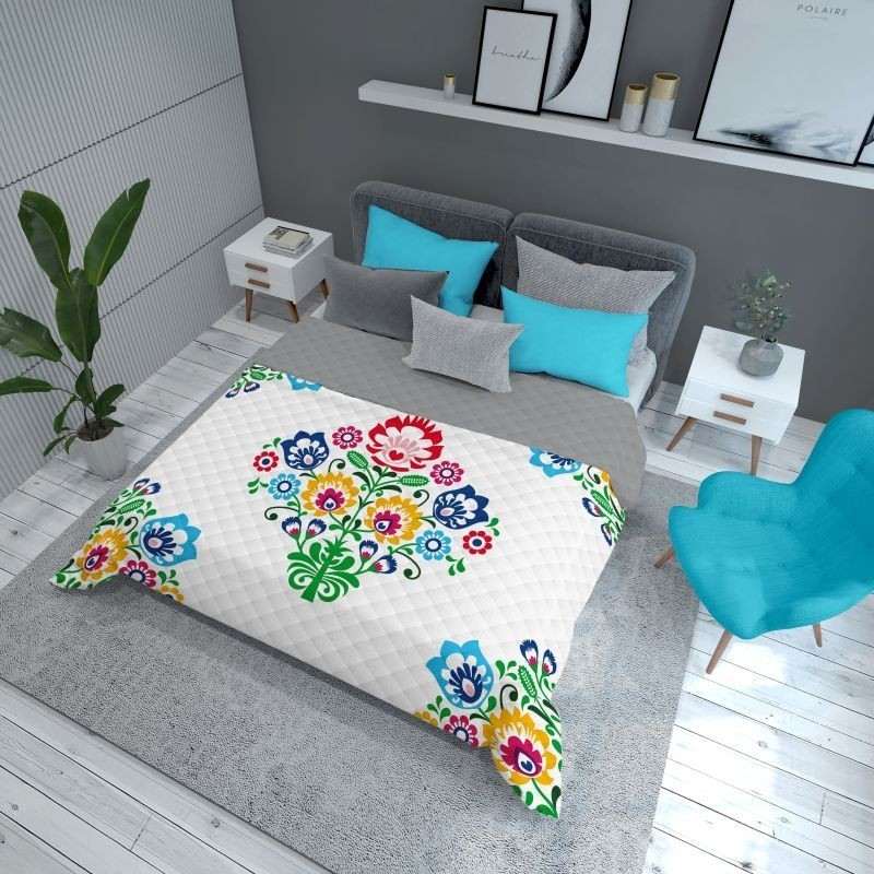 Štýlový prehoz Folklor biela s folklórnym kvetinovým motívom na prednej strane a jednofarebným podkladom na zadnej strane. Tento ľahký prehoz slúži nielen ako dekorácia, ale aj ako praktická prikrývka – v horúcich dňoch sa dá použiť namiesto deky. Polyesterový materiál je odolný a ľahko sa udržiava.