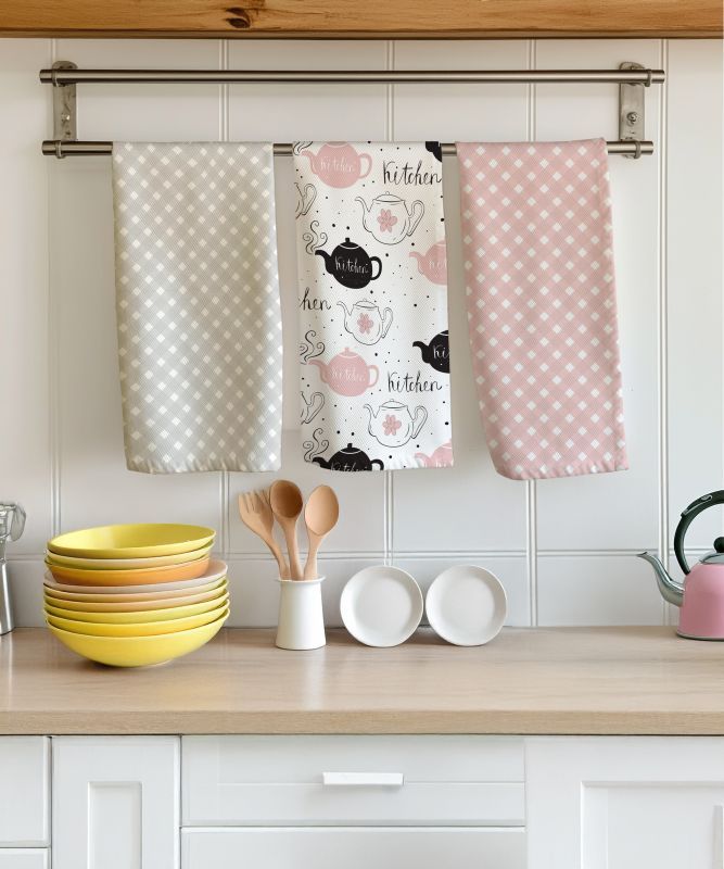 Praktická a štýlová sada troch bavlnených kuchynských utierok s motívom kanvic – ideálne ako dekorácia i na bežné používanie v kuchyni. Každá utierka má iný potlač, všetky tri sú farebne a dizajnovo zladené a spolu tvoria harmonický celok. Utierky majú rozmery 40 × 60 cm, vhodnú veľkosť pre časté utieranie rúk, riadu alebo ako dekoratívny doplnok. Materiál z 100 % bavlny je savý, jemný na dotyk a odolný voči častému praniu.