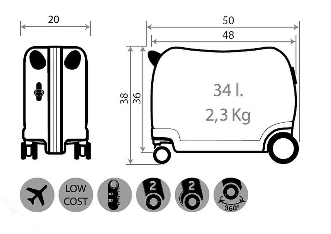 Detský kufrík od výrobcu Joummabags je vyrobený z kvalitného ABS plastu. Detský kufor na kolieskach pre dievčatá aj chlapcov má škrupinový obal, ktorý je odolný voči nárazom a chráni vnútorný obsah pred poškodením. Na kufríku môžu deti sedieť aj sa posúvať ako na odrážadle. Predné otočné kolieska umožňujú ľahšiu manipuláciu. Rozmer kufríka je 50x38x20 cm a objem 34 l, nosnosť je 30 kg. Kufor je možné použiť ako príručnú batožinu pre nízkonákladové lety.