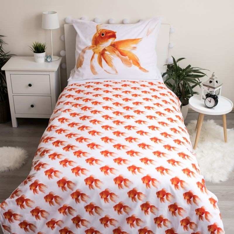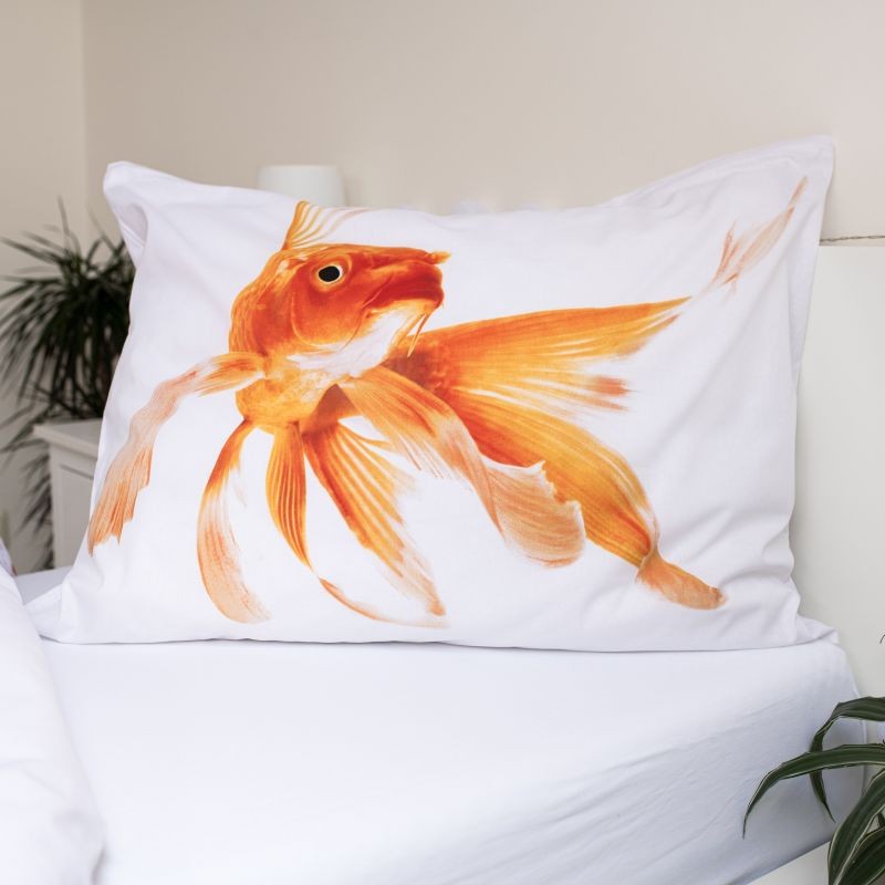 Elegantné obliečky s motívom pôvabnej zlatej rybky – z každej strany iný dizajn: jedna strana zobrazuje výraznú rybku, druhá je zdobená jemným vzorom menších rybičiek na svetlom podklade. Vyrobené z mäkkej bavlny s praktickým zapínaním na zips, tieto obliečky sú ľahké na údržbu a veľmi pohodlné na spánok.