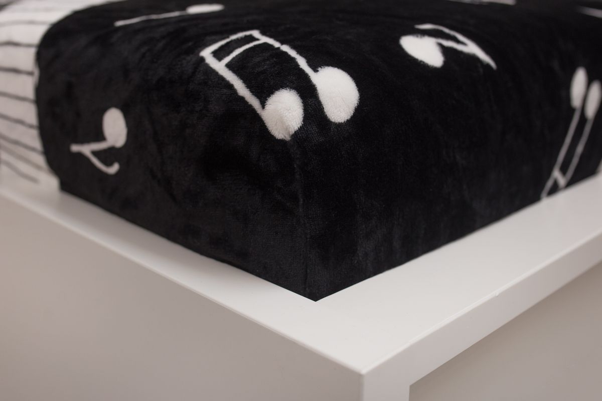 Hebká a hrejivá napínacia plachta s motívom hudobných nôt v kontrastnej čierno-bielej kombinácii. Povrch plachty jemný plyš – mikroplyš, ktorý je príjemný na dotyk a navyše dobre izoluje teplo. Plachta je opatrená elastickým lemom, ktorý zabezpečuje, že pevne drží na matraci bez shrňovania. Je vhodná pre bežné matrace s výškou až do cca 25 cm.